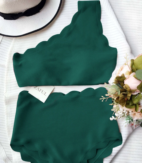 The first thing is a swimsuit, panties have a high waist, the finish is beautiful, wavy, while the top of the outfit is on one shoulder which is very fashionable this season and this green color - divine. Recently, I'm crazy about this color